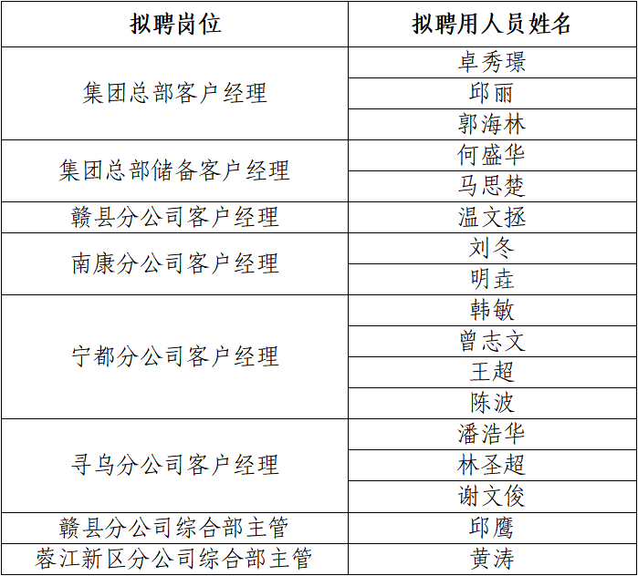 公示期為2023年8月11日至2023年8月15日,公示期間如有異議,請于2023年8月15日17:00前向贛州市融資擔(dān)保集團(tuán)有限公司黨群工作部(人力資源部)口頭或書面反映,聯(lián)系方式:郵箱jsydbrsb@163.com,電話0797-8198816。